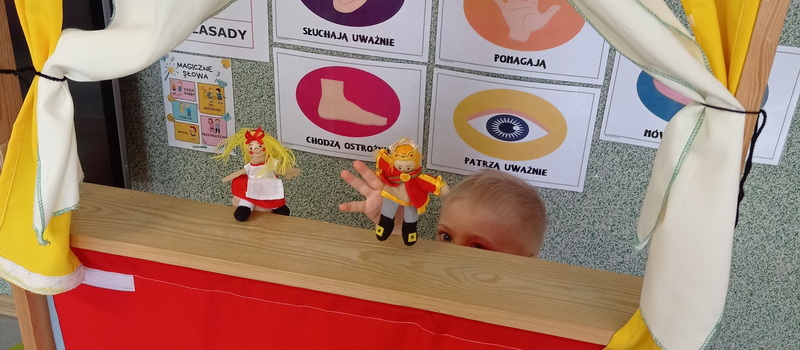 Realizując temat kompleksowy "Przygoda z teatrem" dzieci poznały pojęcia związane z teatrem np. scena, kurtyna, widownia, rekwizyty.