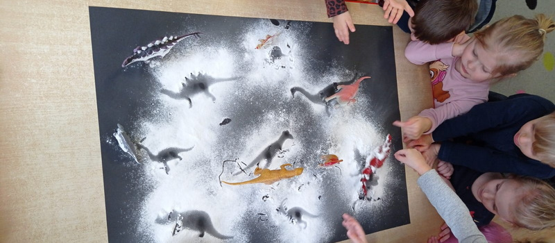 Realizując temat kompleksowy poświęcony prehistorii, przedszkolaki zgłębiły wiedzę na temat życia dinozaurów.