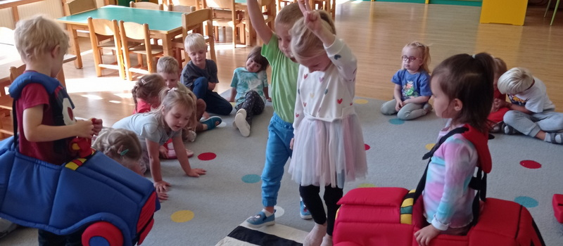 W ramach realizacji tematu kompleksowego „Bezpieczni na drodze" dzieci zapoznały się z tematyką bezpiecznych zachowań w ruchu drogowym.