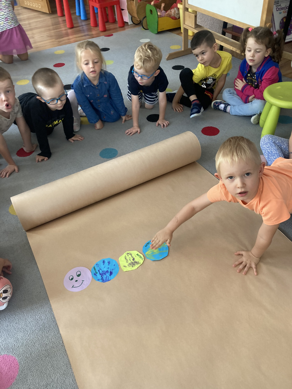 Praca plastyczna "Gąsienica" jaką wykonaliśmy przedstawia odciski dłoni każdego dziecka, każda dłoń jest inna, rozmawiamy o tym, ze kazdy z nas jest inny, inaczej wygląda, inaczej myśli, naszym zadaniem jako nie tylko dobrego przedszkolaka ale i dobrego człowieka jest móc zrozumieć drugą osobę, szanować ją i wspierać ☺️