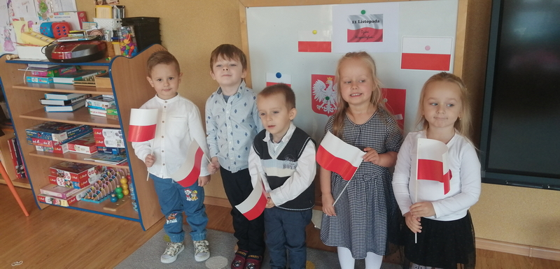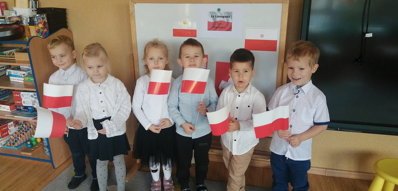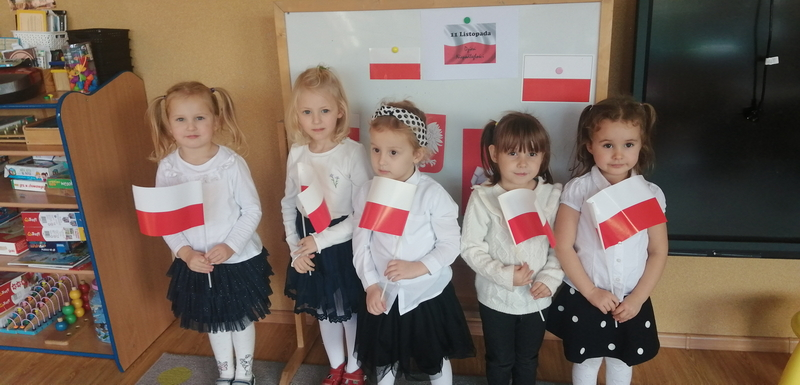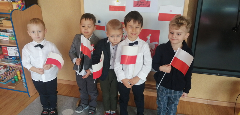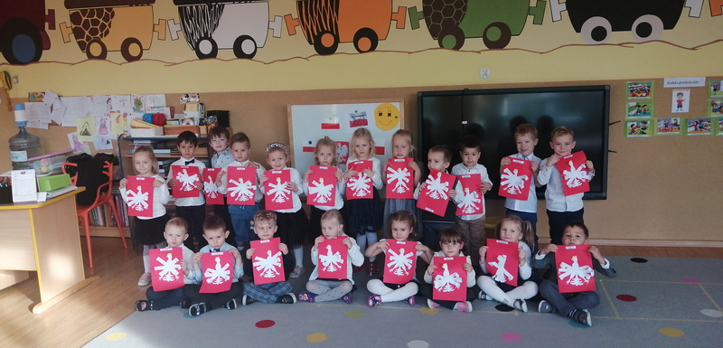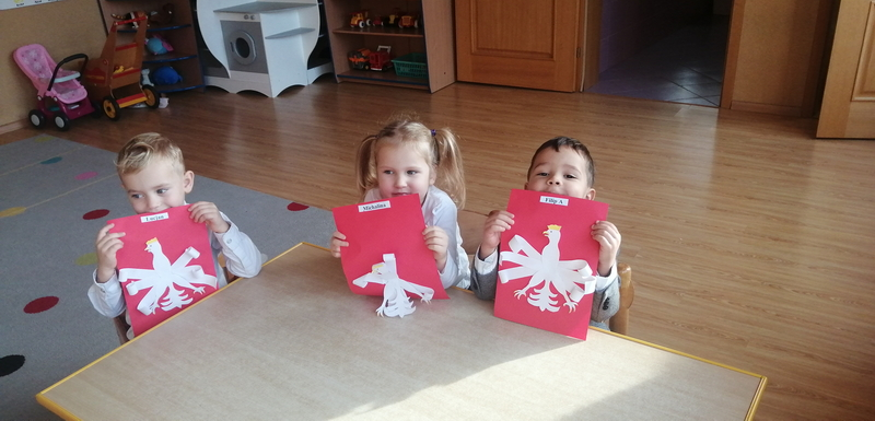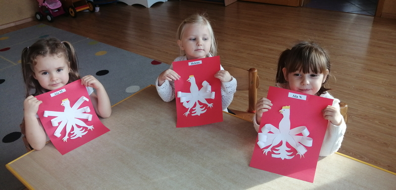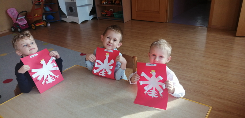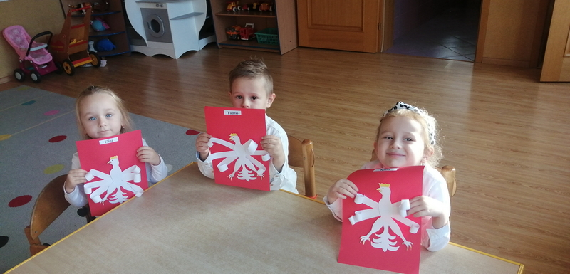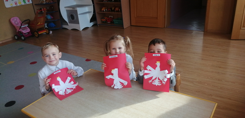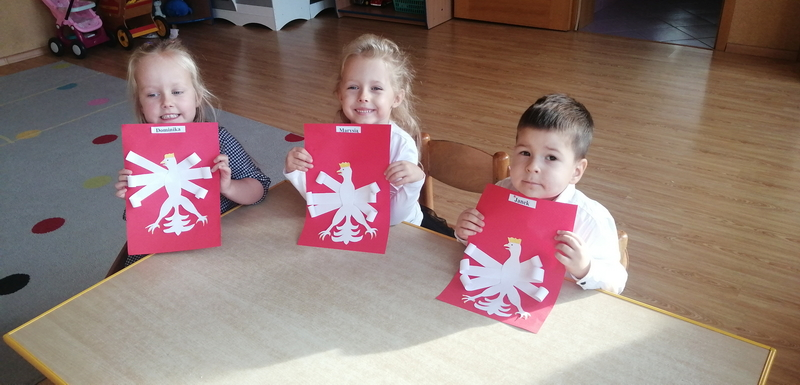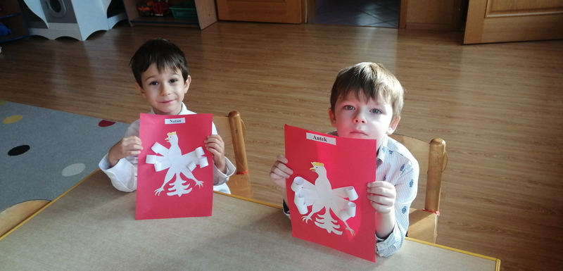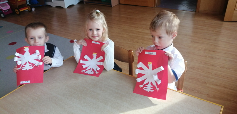 podczas realizacji tematu poznaliśmy polskie symbole narodowe, śpiewaliśmy hymn, podczas zajęć plastycznych wykonaliśmy kotyliony oraz godło.