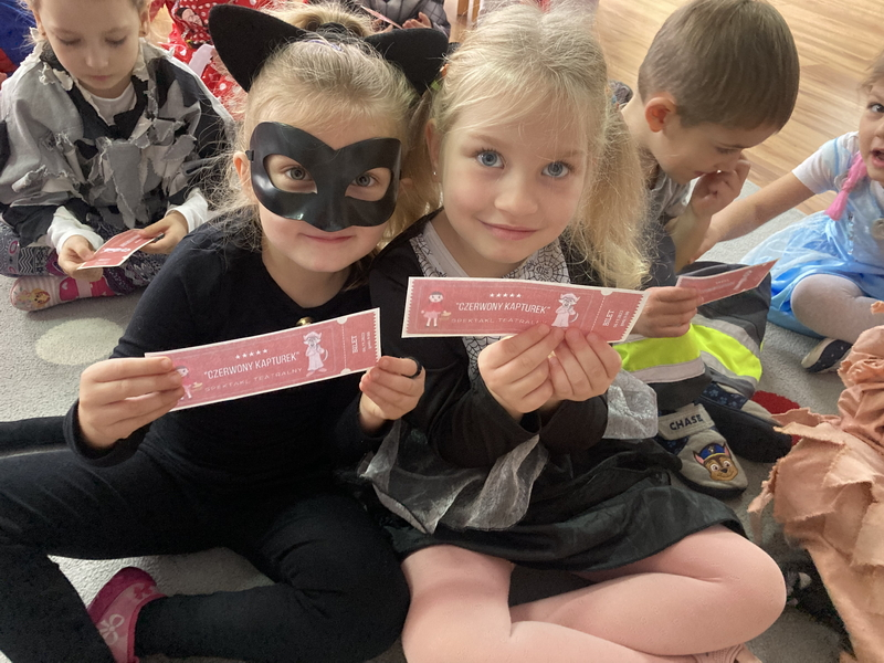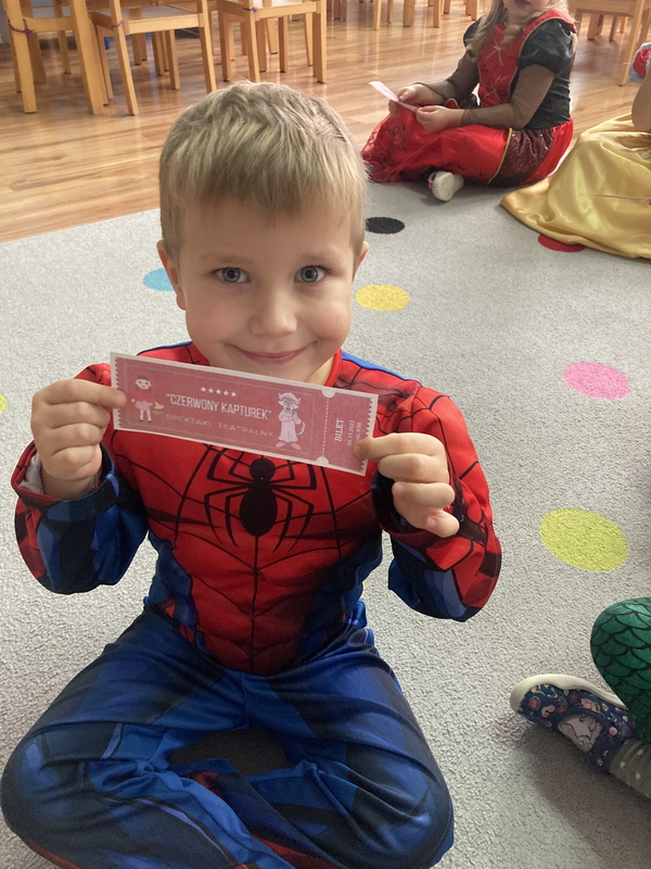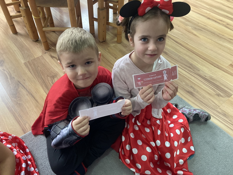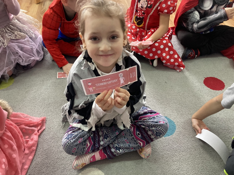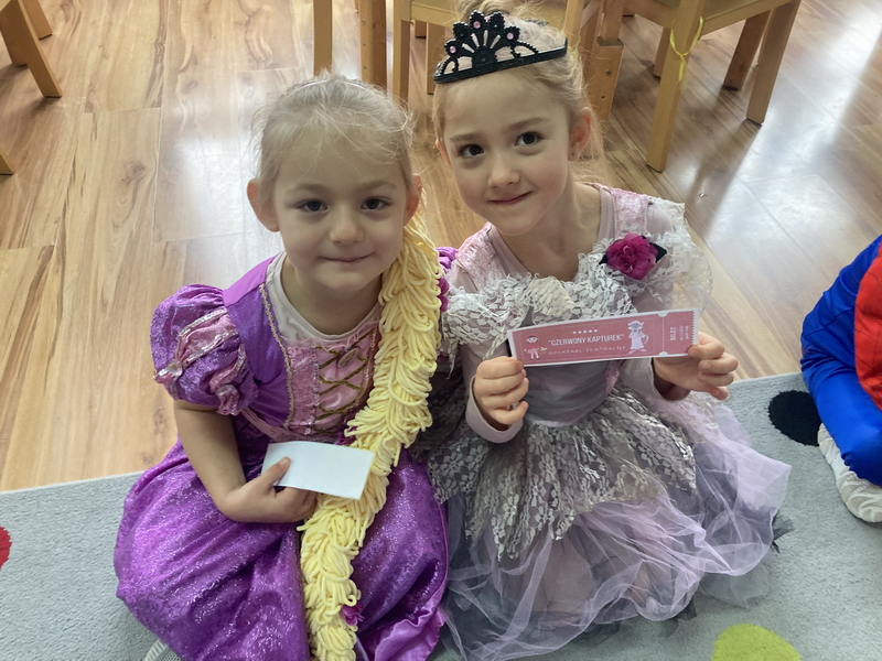 Dzień Postaci z bajek - po obejrzeniu przedstawienia teatralnego pt."Czerwony Kapturek", układaliśmy historyjki znanych nam bajek i wykonaliśmy bajkowe kodowanie.