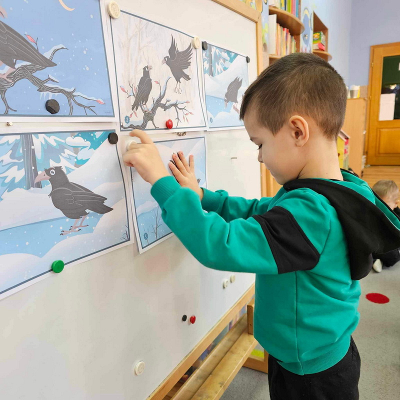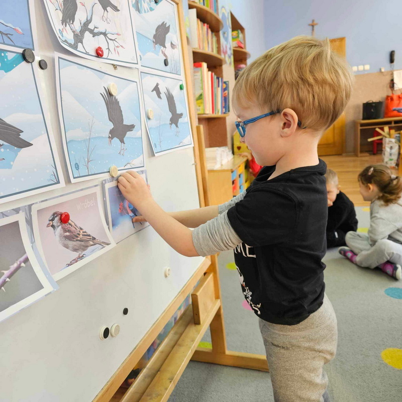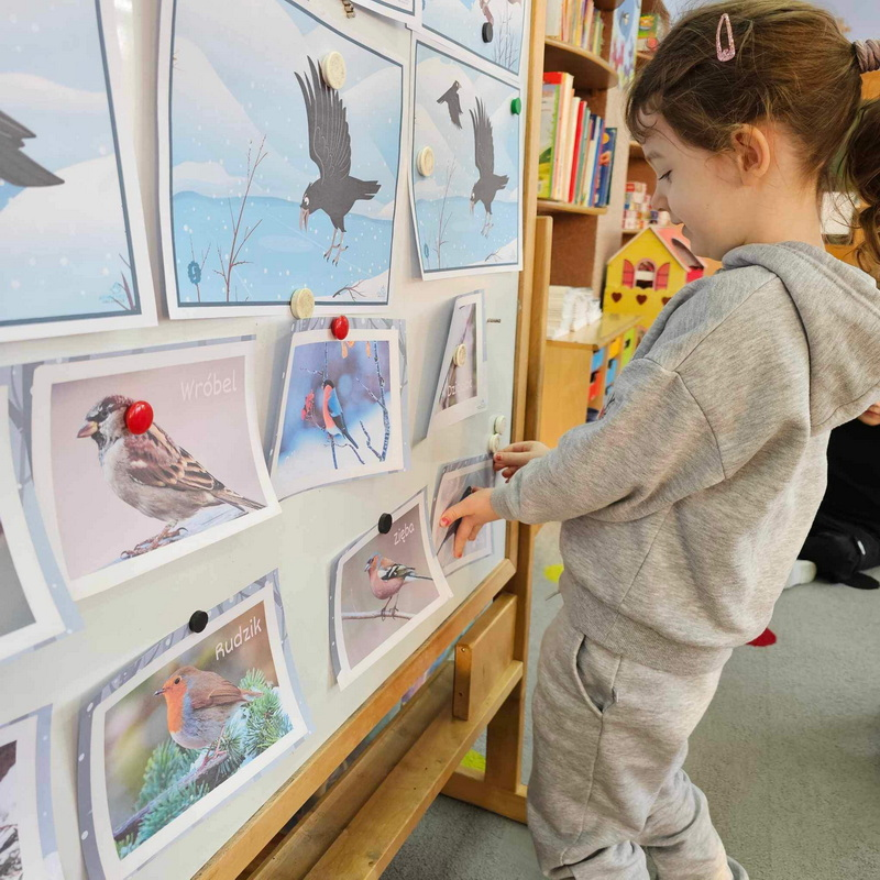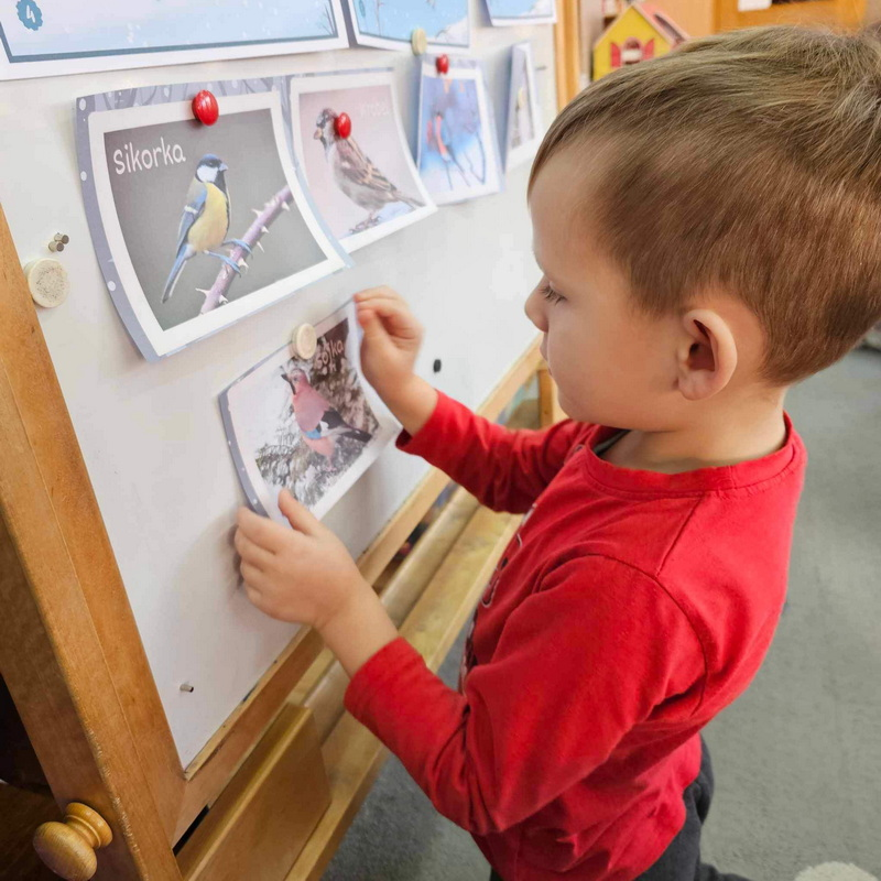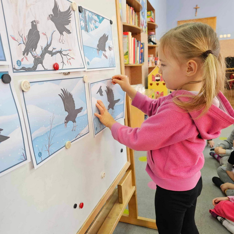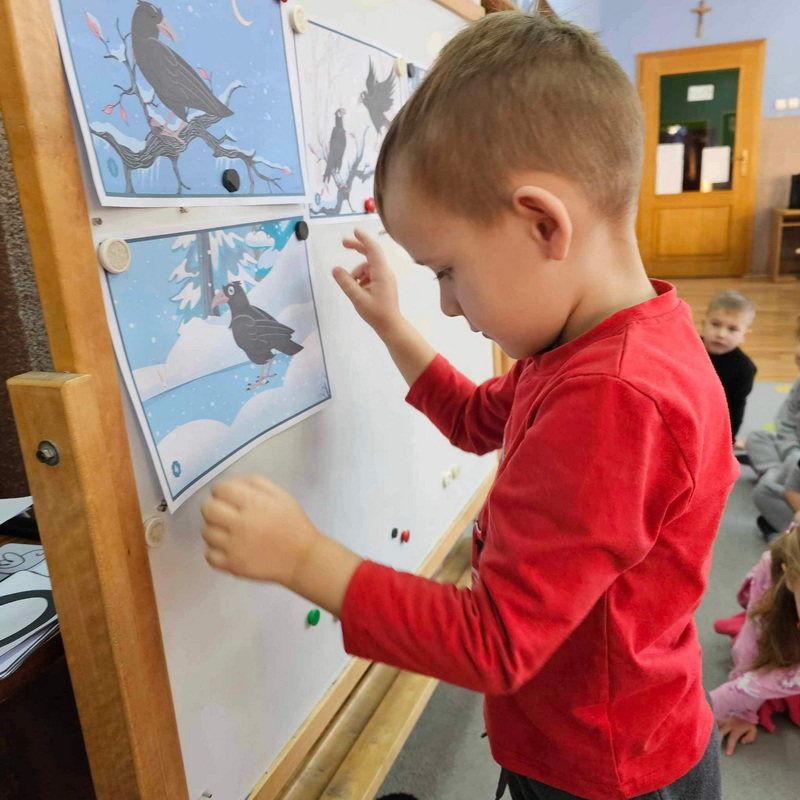 ułożenie historii obrazkowej, przypomnienie ptaszków zostających z nami na zimę oraz zadanie matematyczne pt. "Ile ptaszków na gałęzi?"