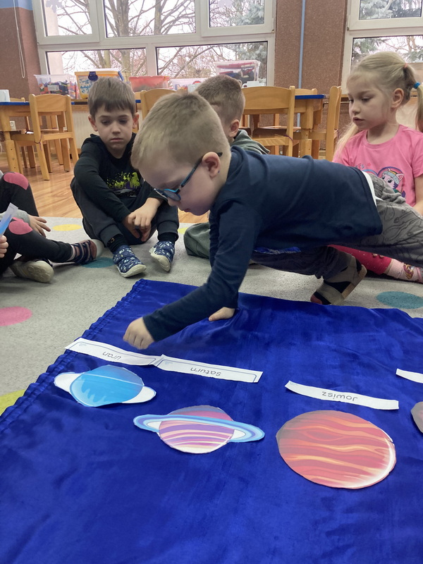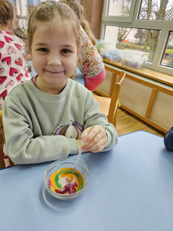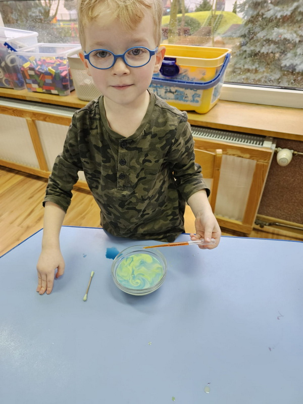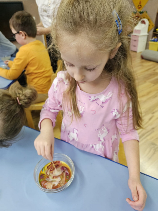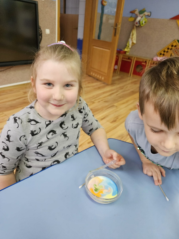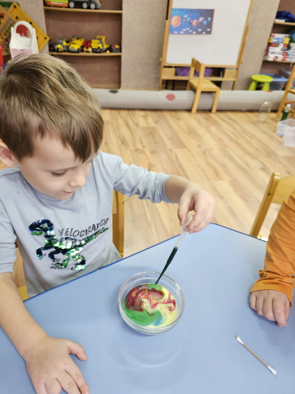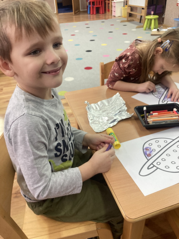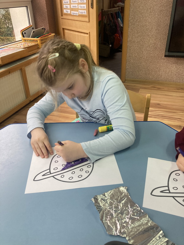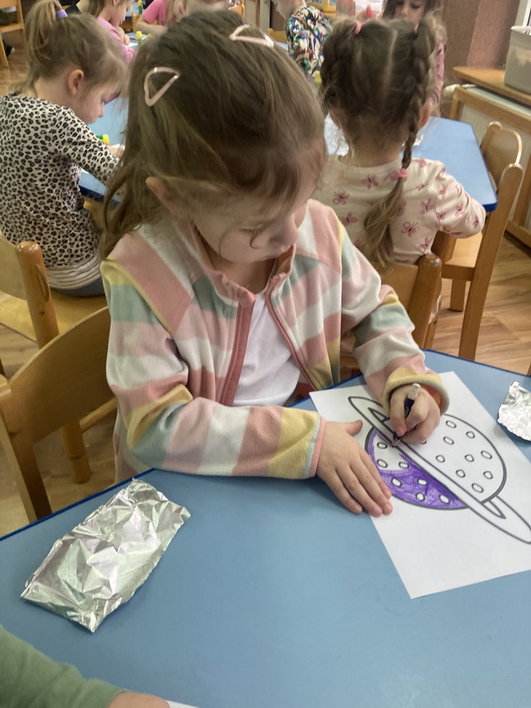 stworzyliśmy prace plastyczne o tematyce kosmosu oraz malowaliśmy na mleku, co przypominało drogę mleczną.