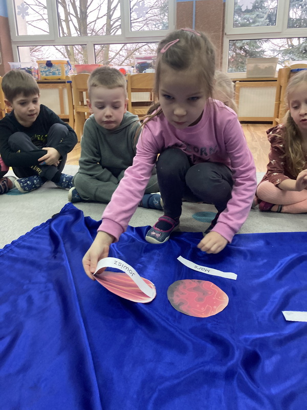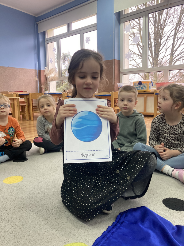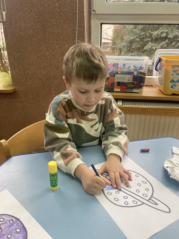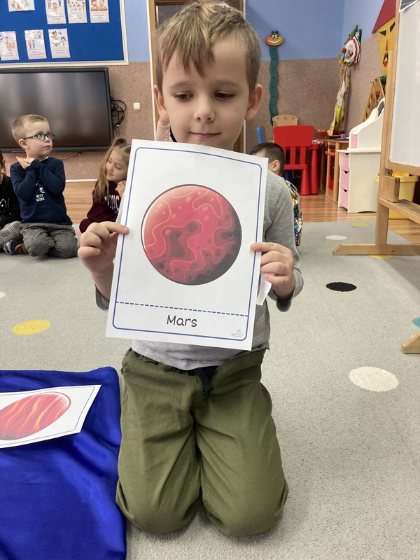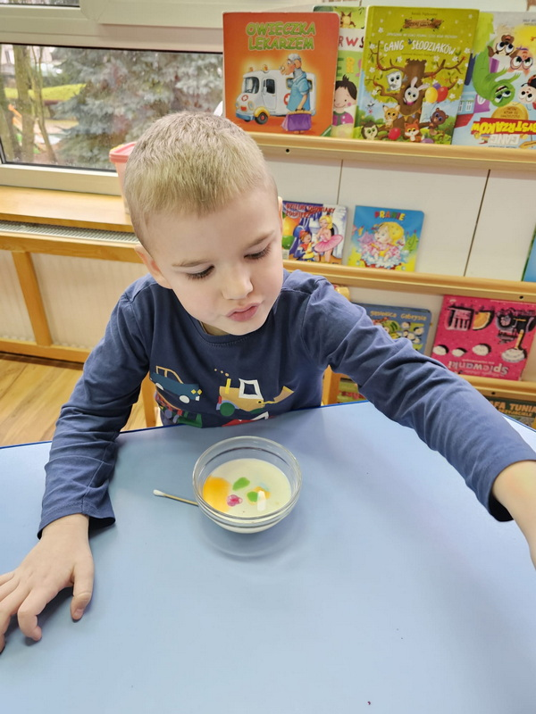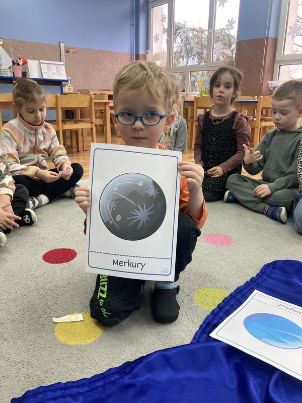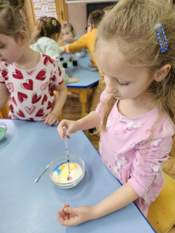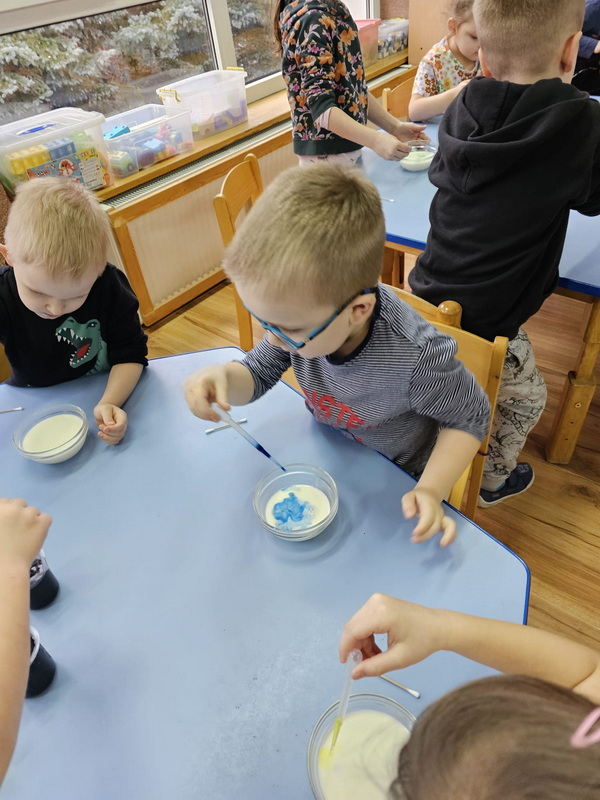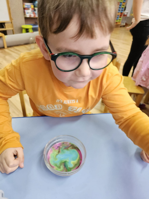 stworzyliśmy prace plastyczne o tematyce kosmosu oraz malowaliśmy na mleku, co przypominało drogę mleczną.