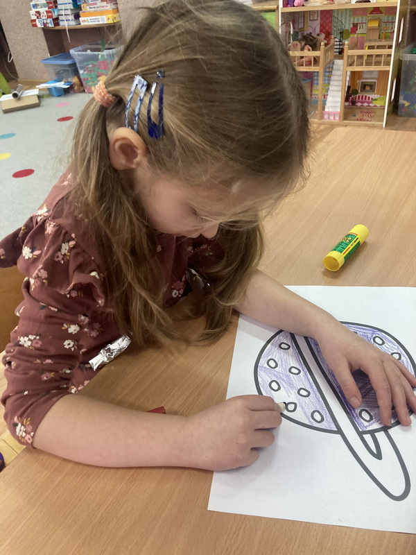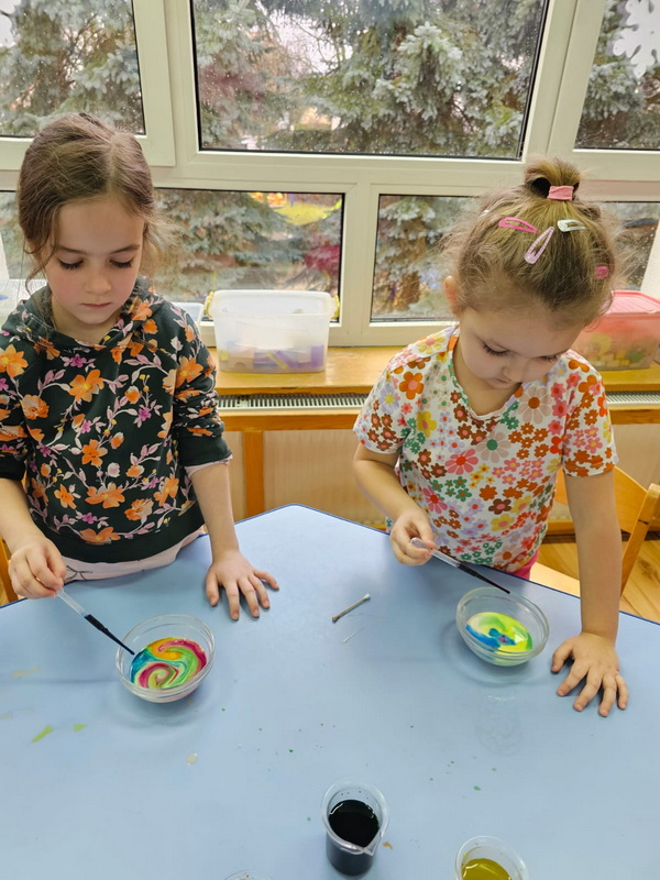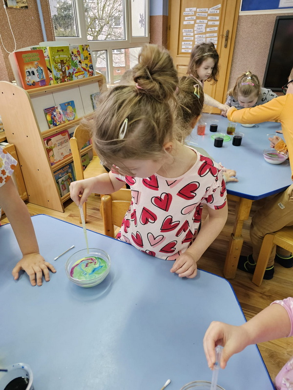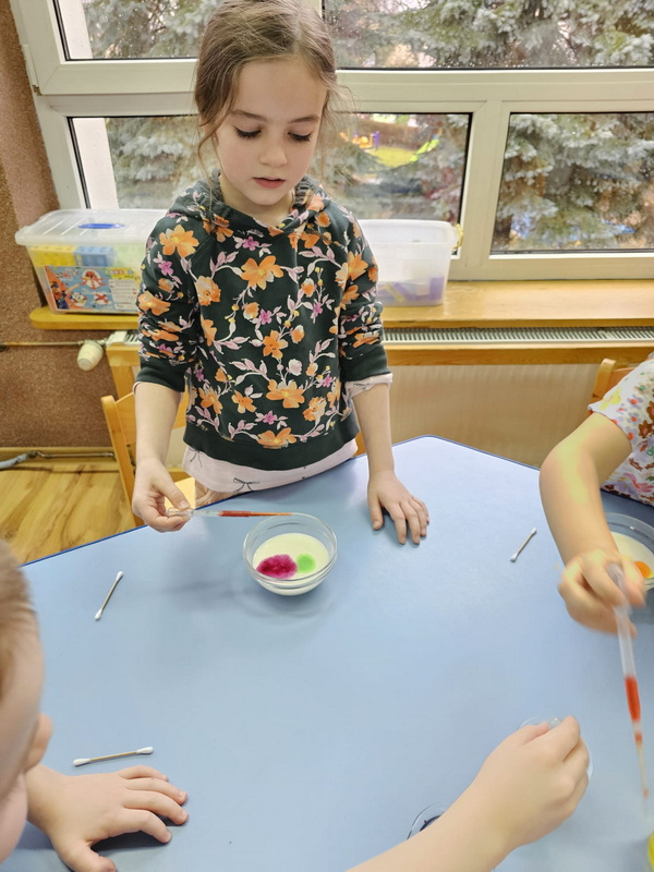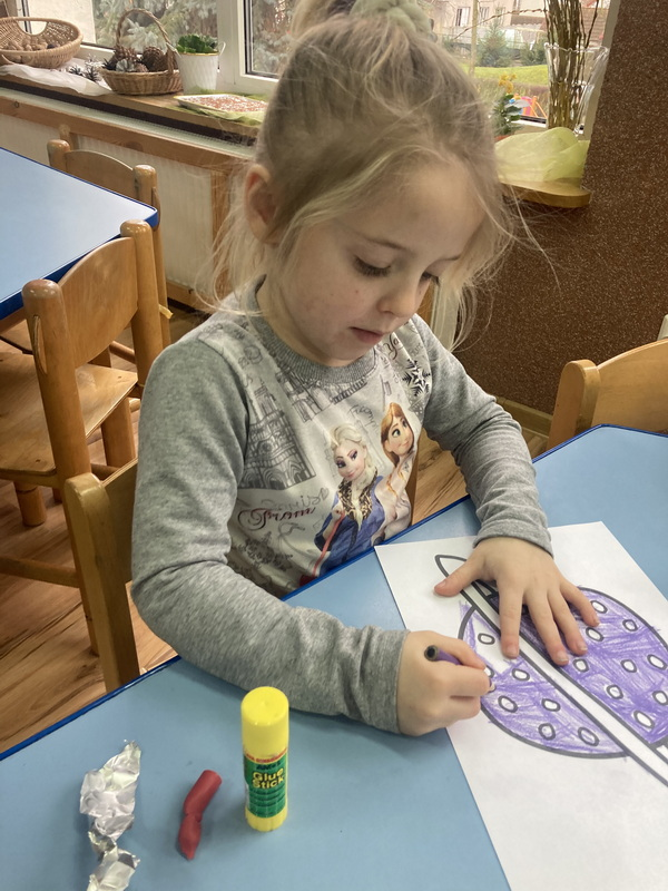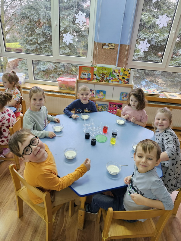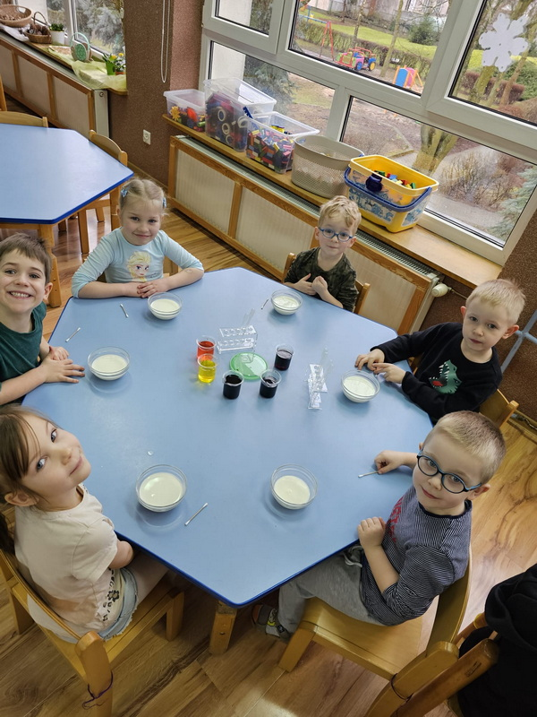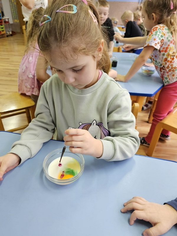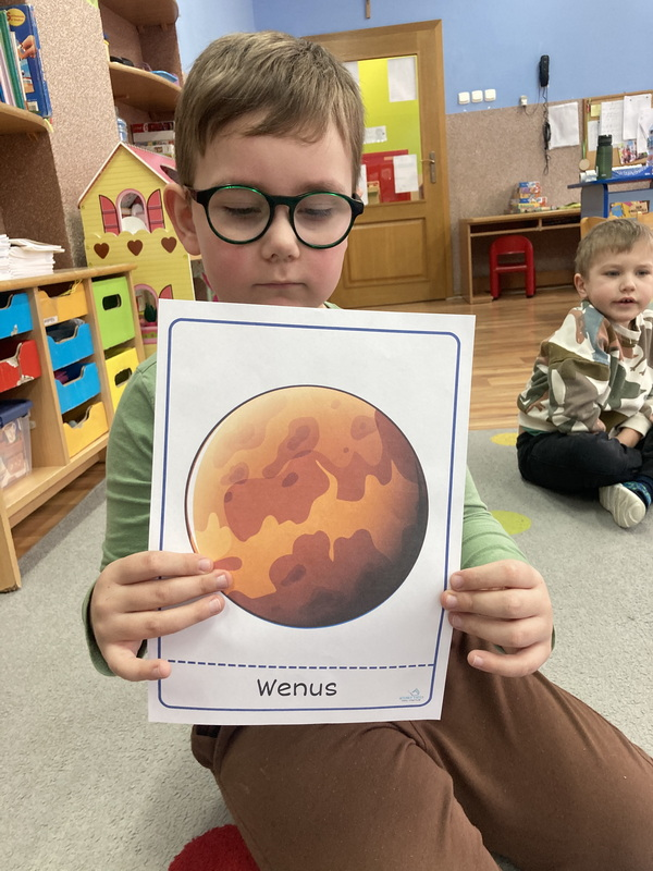 stworzyliśmy prace plastyczne o tematyce kosmosu oraz malowaliśmy na mleku, co przypominało drogę mleczną.