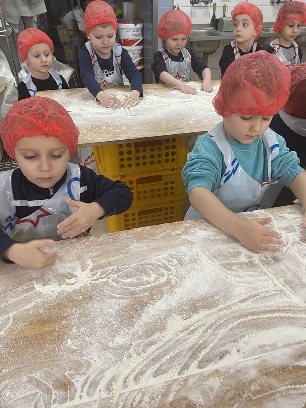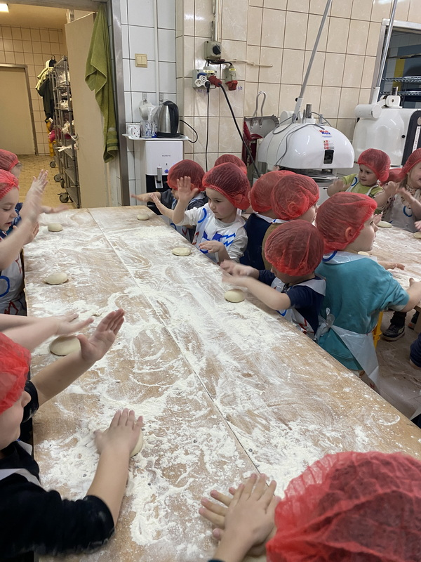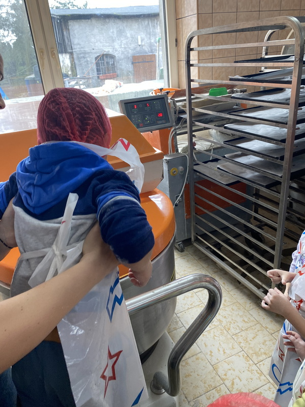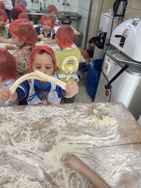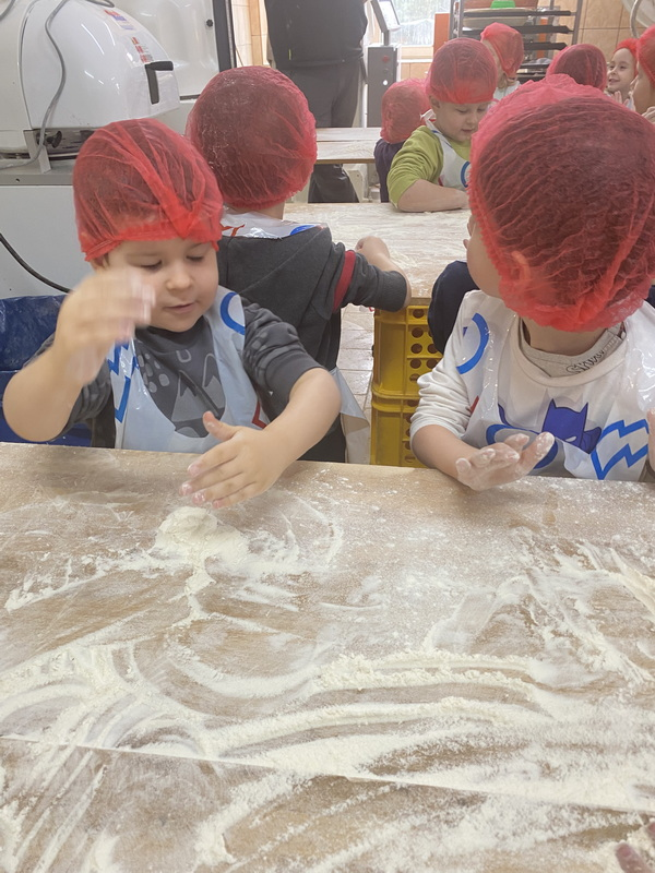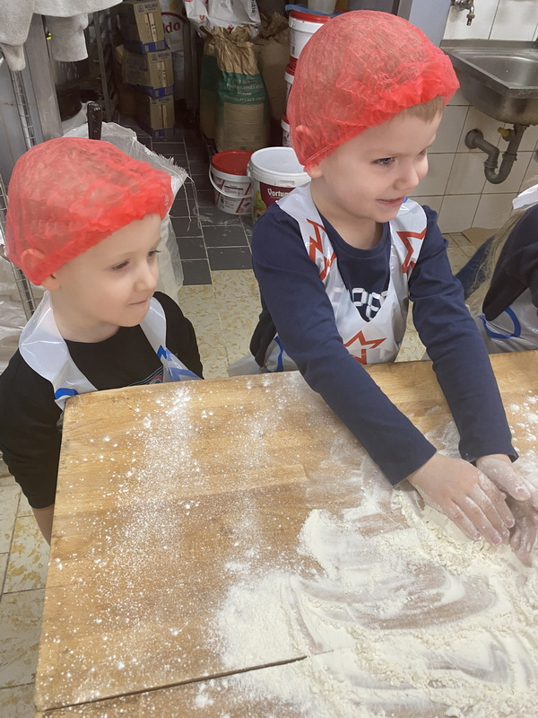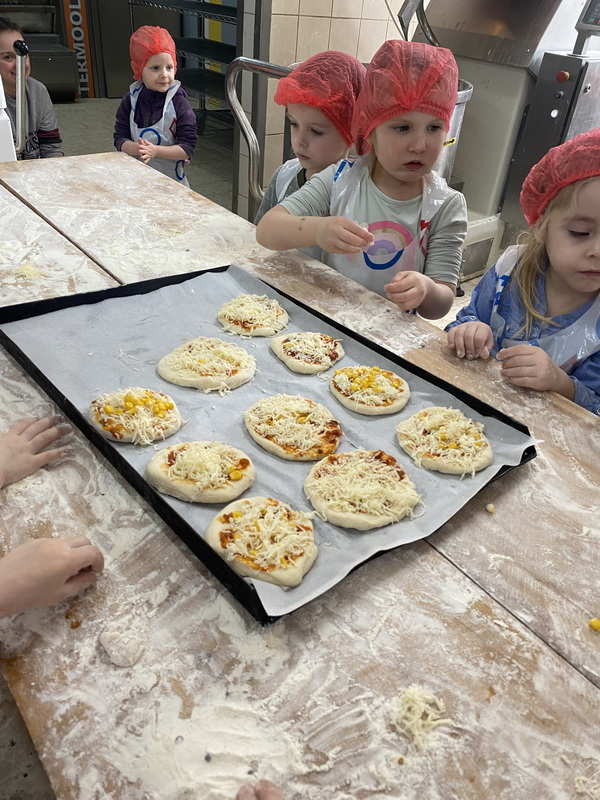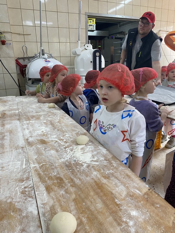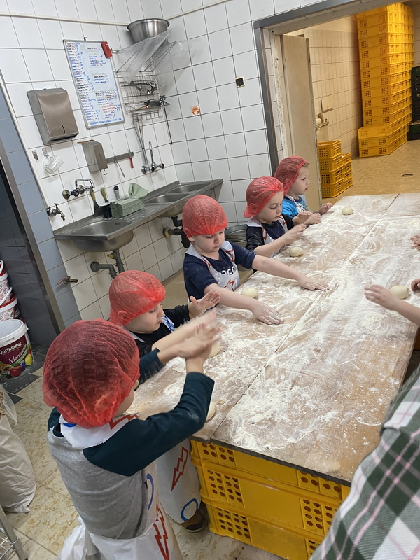 Mieliśmy szansę zapoznać się z zawodem piekarza, zobaczyć wiele maszyn potrzebnych do pracy w tym zawodzie oraz samodzielnie przygotowaliśmy pizzerki, bułeczki z czekoladą i bułeczki z sezamem.