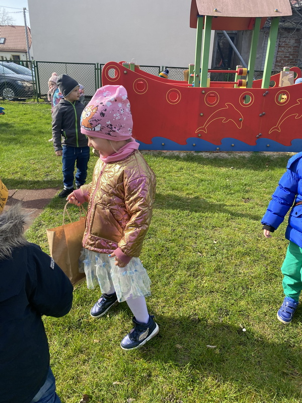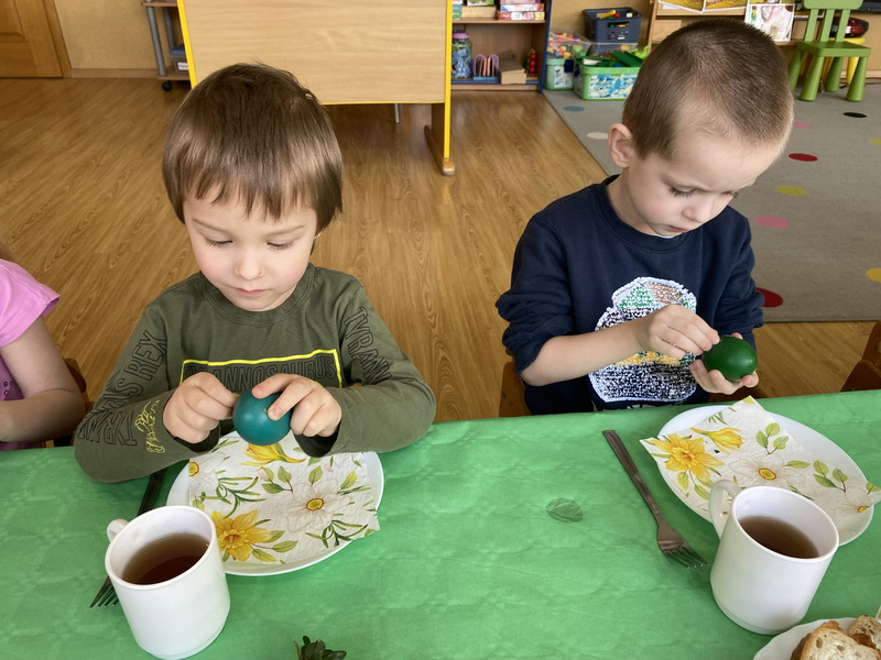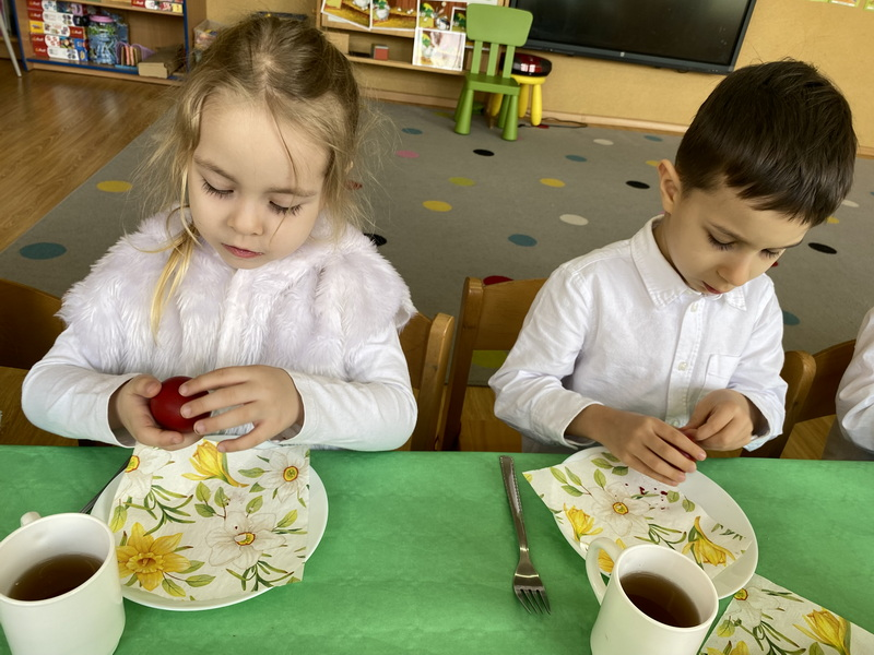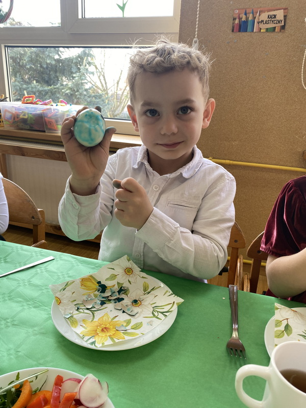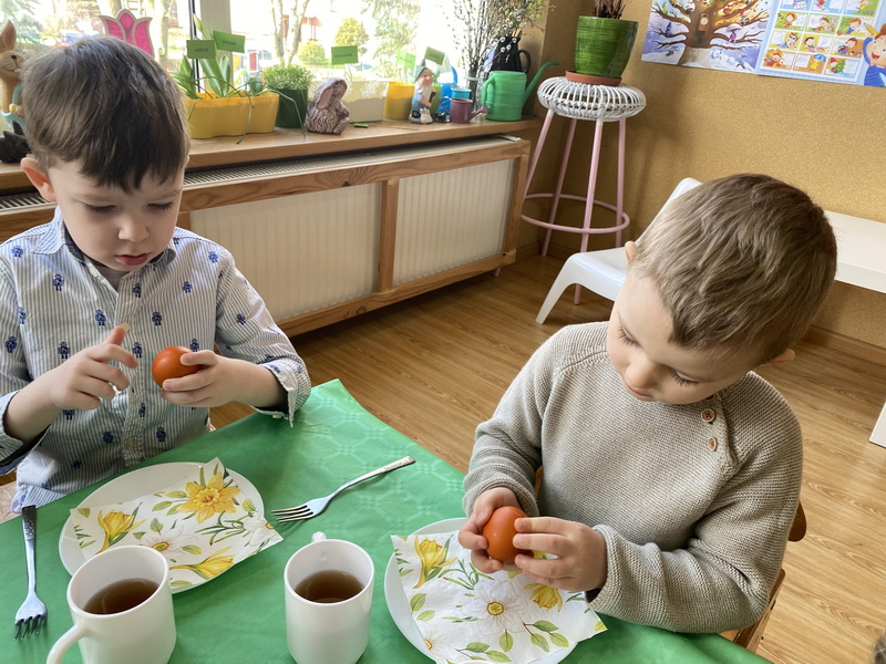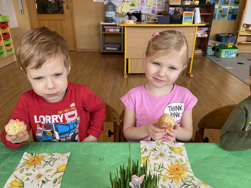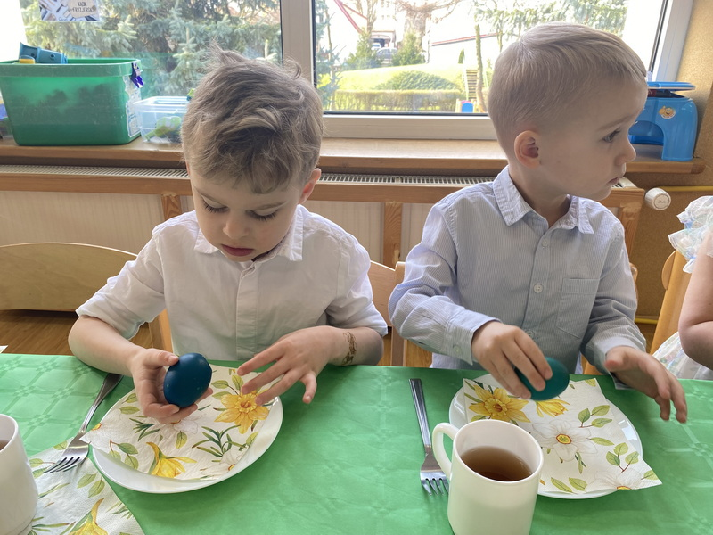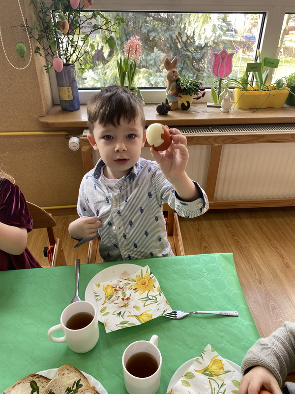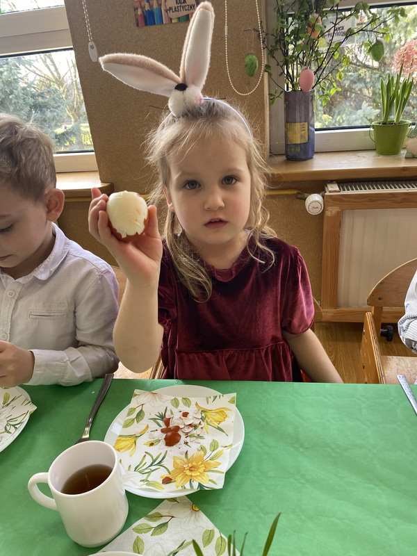 Przed śniadaniem dzieci obrały samodzielnie jajka, które następnie zostały zjedzone wraz z innymi pysznościami, takimi jak m.in: pieczywo, wędliny, pasztet drobiowy, oraz babka cytrynowa. Następnie wyruszyliśmy na poszukiwania prezentów, które zostawił Zając w ogrodzie.