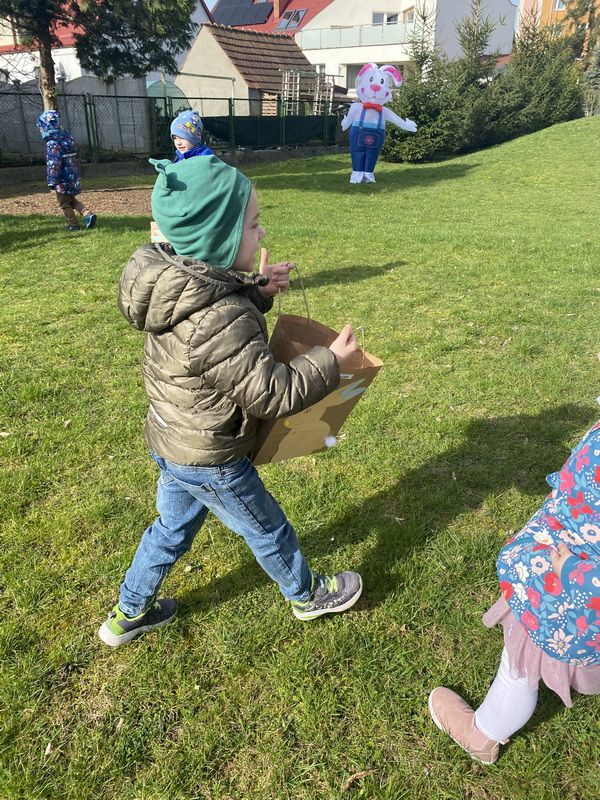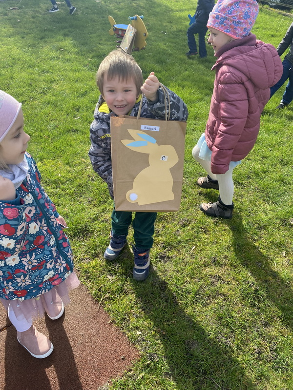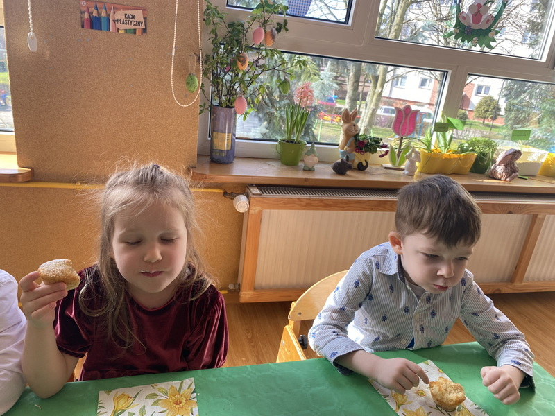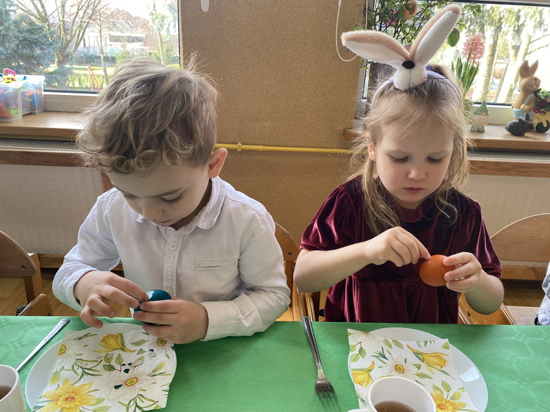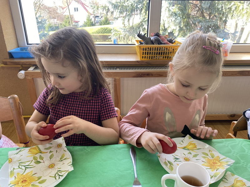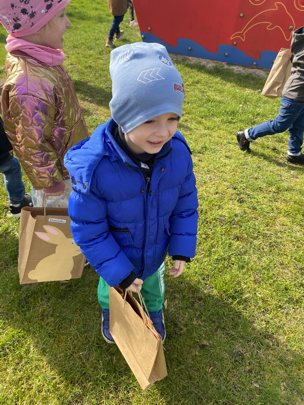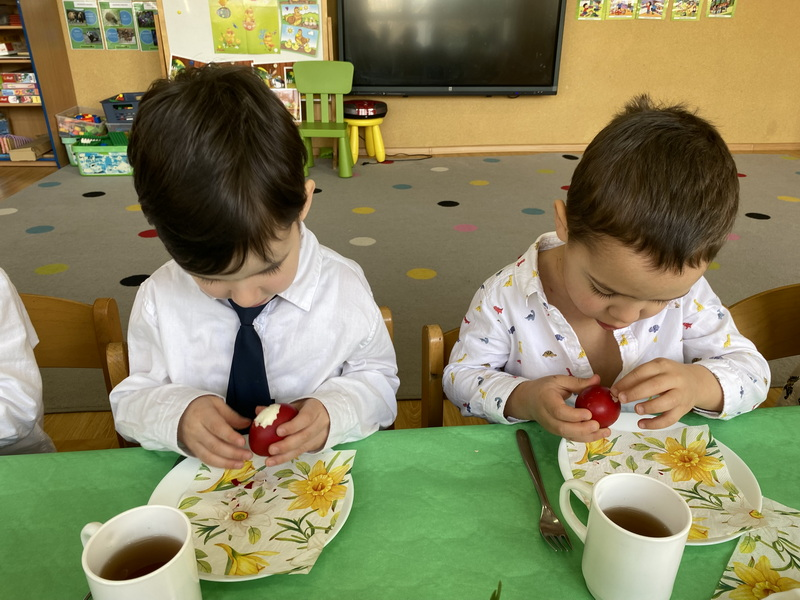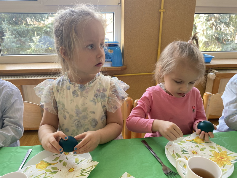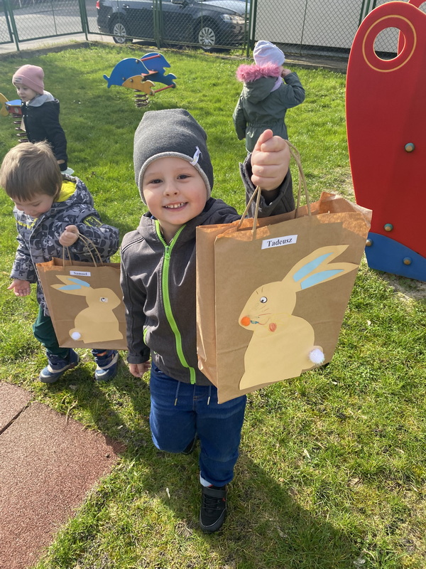 Przed śniadaniem dzieci obrały samodzielnie jajka, które następnie zostały zjedzone wraz z innymi pysznościami, takimi jak m.in: pieczywo, wędliny, pasztet drobiowy, oraz babka cytrynowa. Następnie wyruszyliśmy na poszukiwania prezentów, które zostawił Zając w ogrodzie.