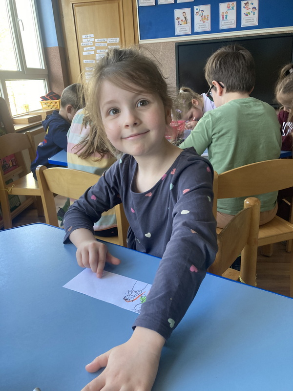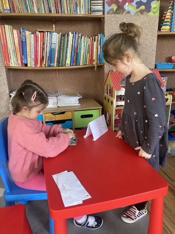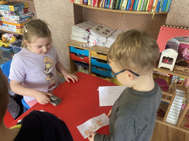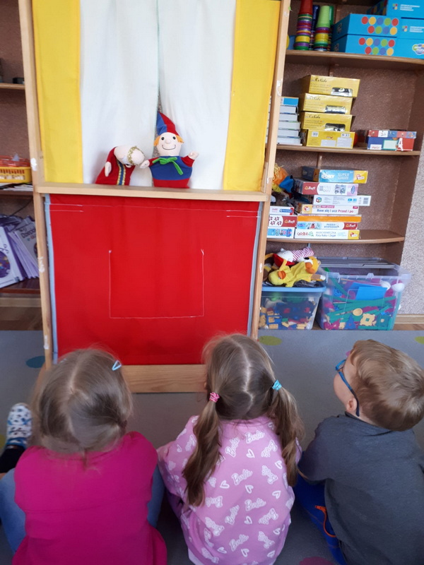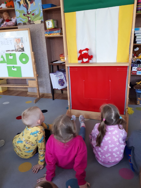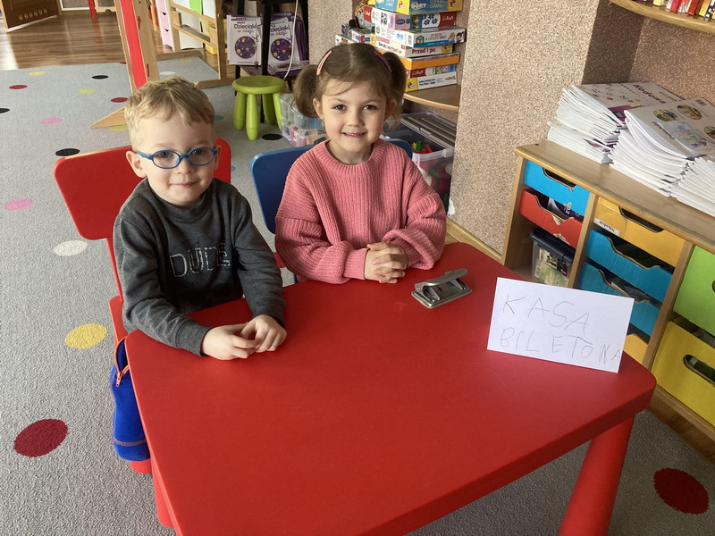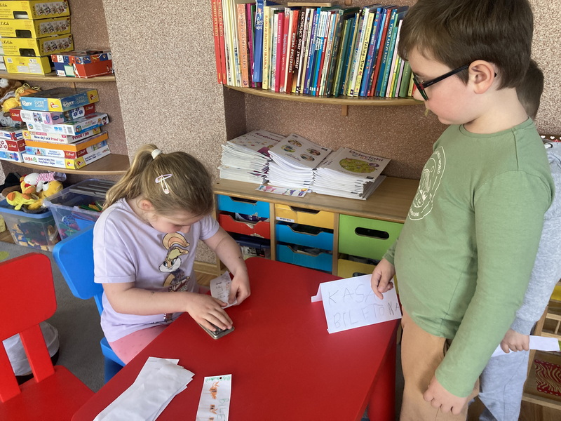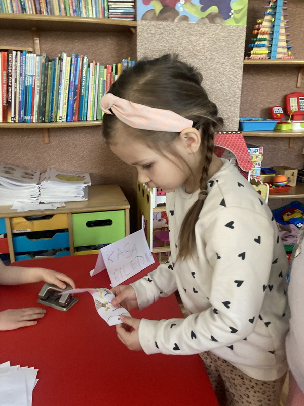 kukiełkami, ale także uczestniczyliśmy w spektaklu z wykorzystaniem pacynek pt. "Legenda o Smoku Wawelskim". Wykonaliśmy kolorowe bilety, które zostały sprawdzone w kasie biletowej.