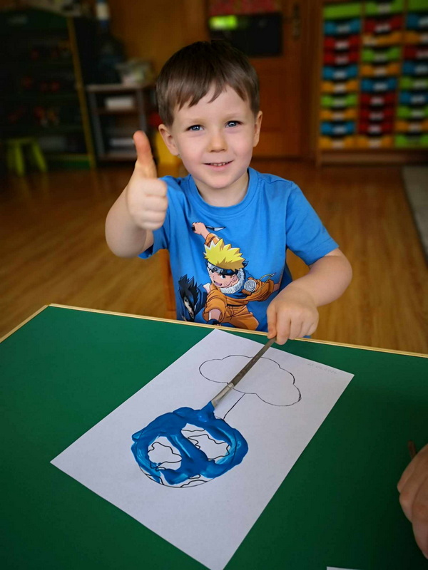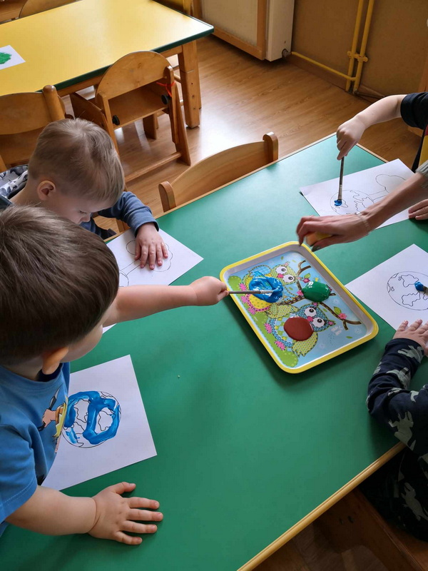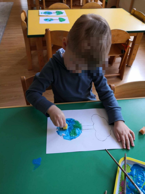 Realizując temat o Dniu Ziemii dzieci m.in. wykonały pracę plastyczną przy użyciu farby, pędzla oraz gąbki.