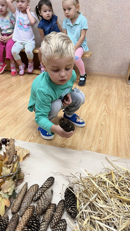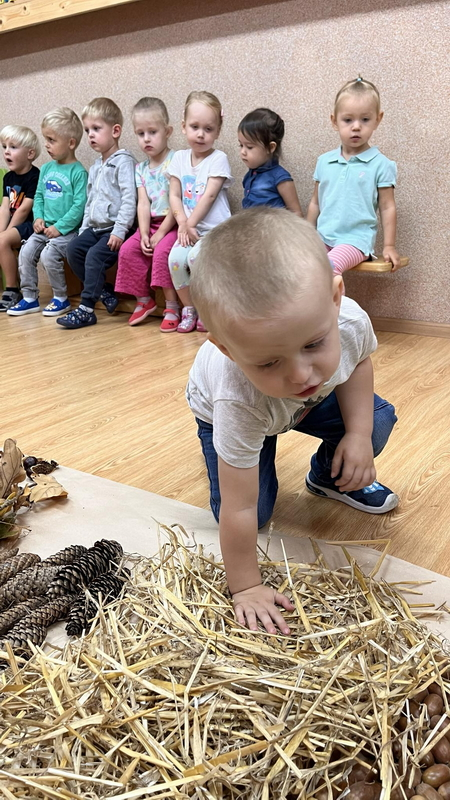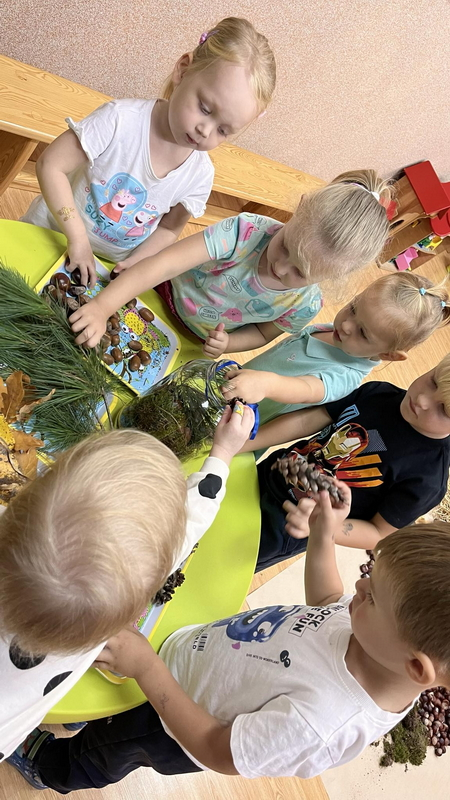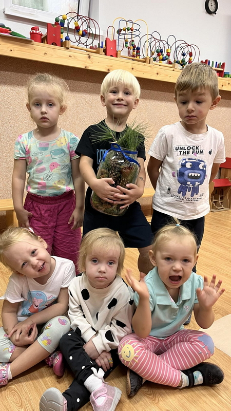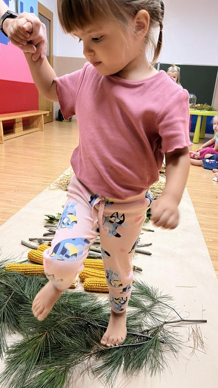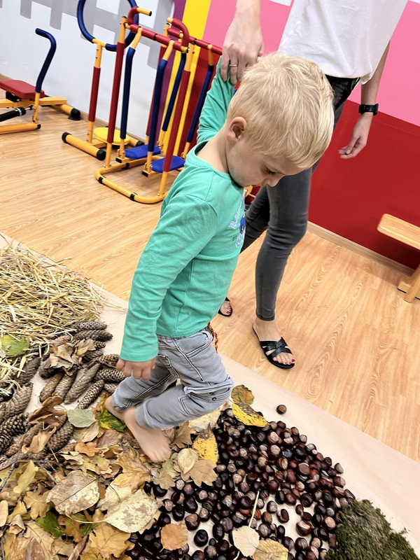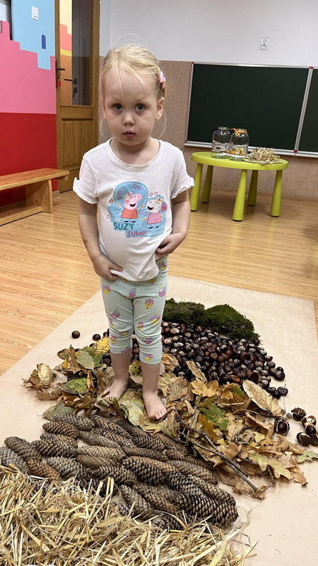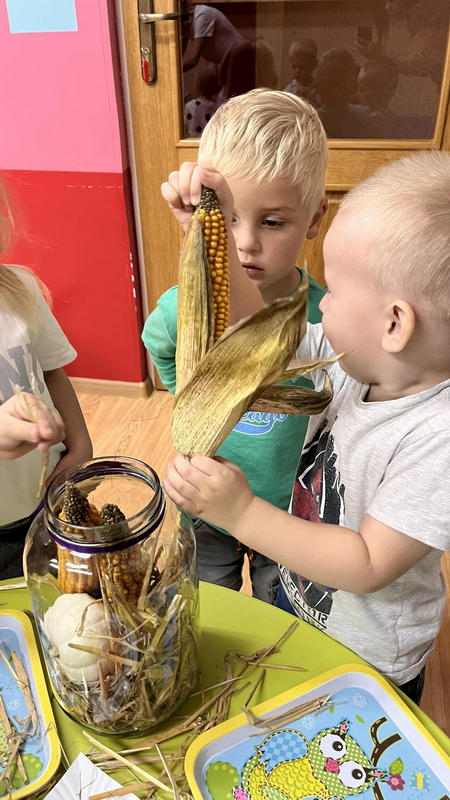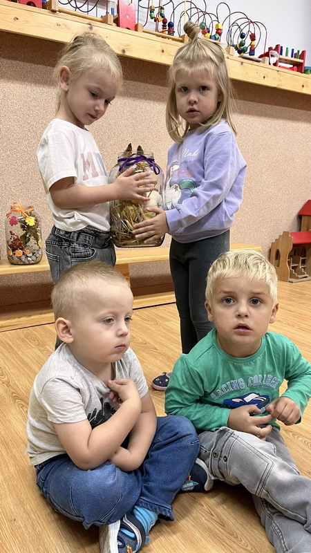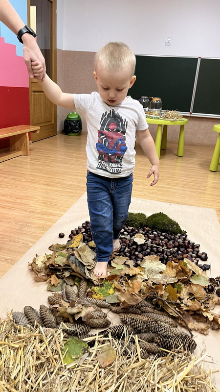 Przedszkolaki przygotowały ścieżkę sensoryczną - rozwijały swoje wrażenia dotykowe i stymulowały zmysły przechodząc boso po liściach, gałązkach, szyszkach, słomie, kukurydzy, żołędziach, kasztanach. Stworzyły również jesienne kompozycje - wypełniły słoiki jesiennymi skarbami. W słoikach znalazły się m.in. gałązki, żołędzie, kasztany, kwiaty, szyszki, kolorowe liście, kukurydza, jabłka, dynie. Wszystkie słoiki pięknie się prezentowały i pachniały obecną porą roku.