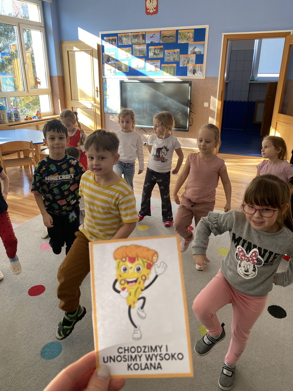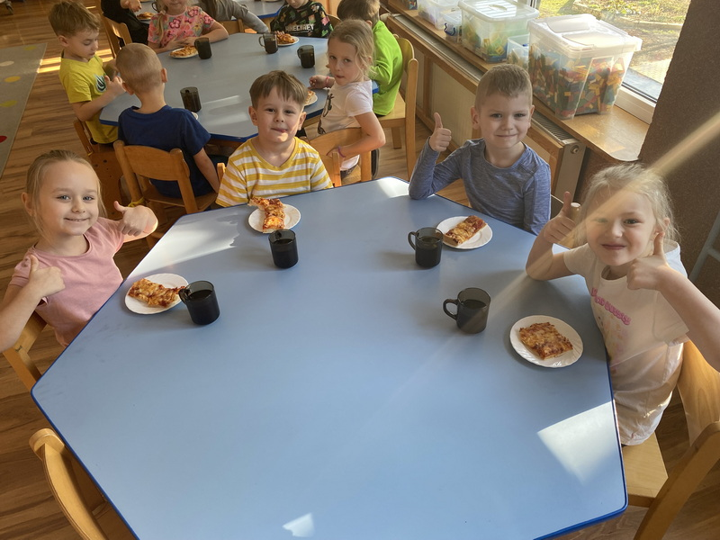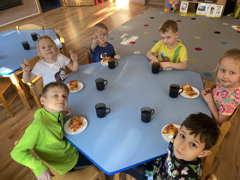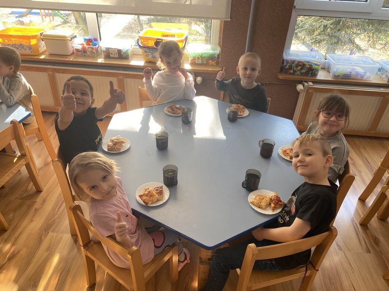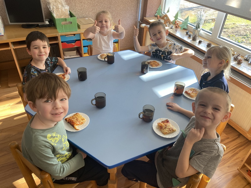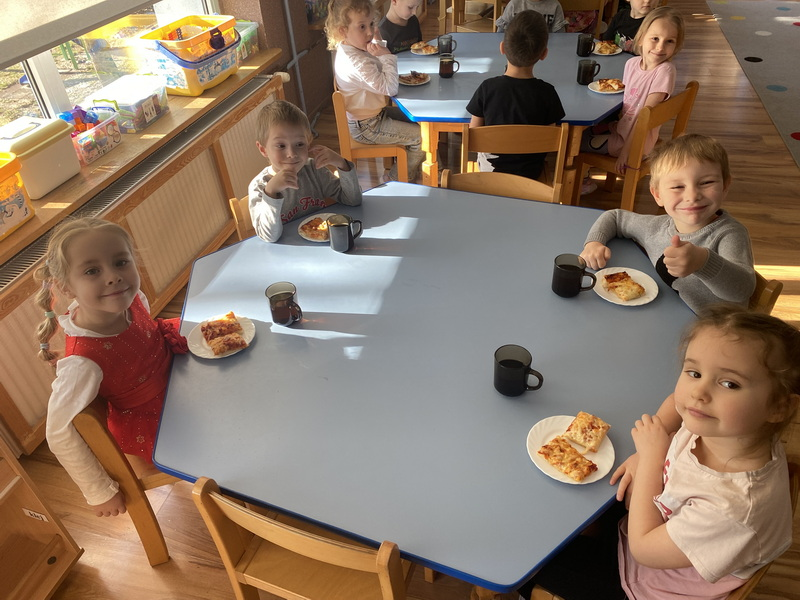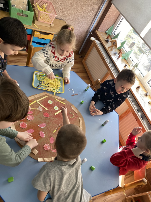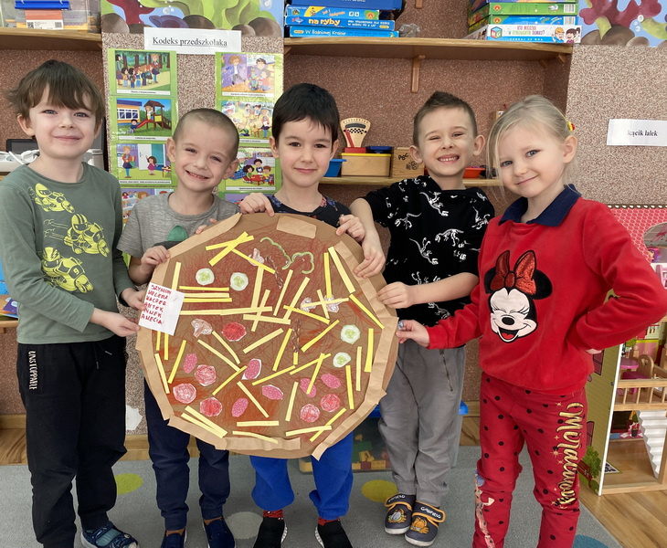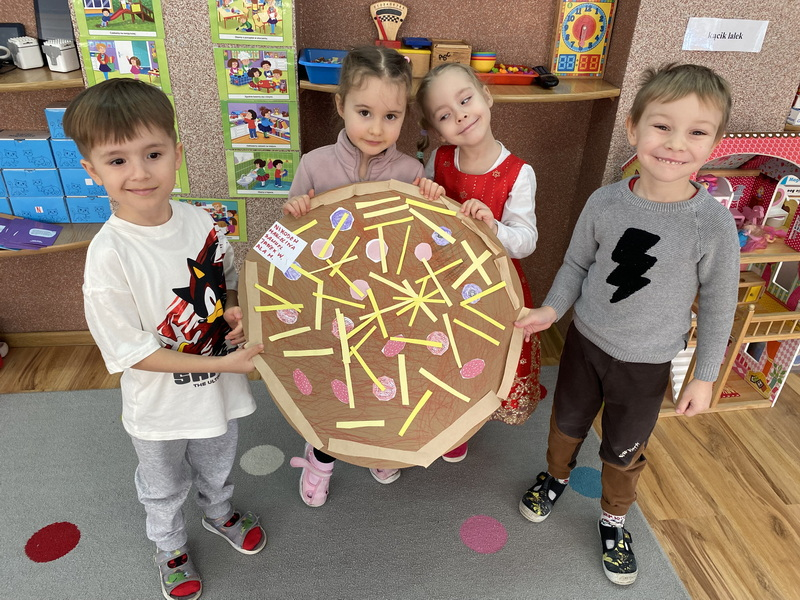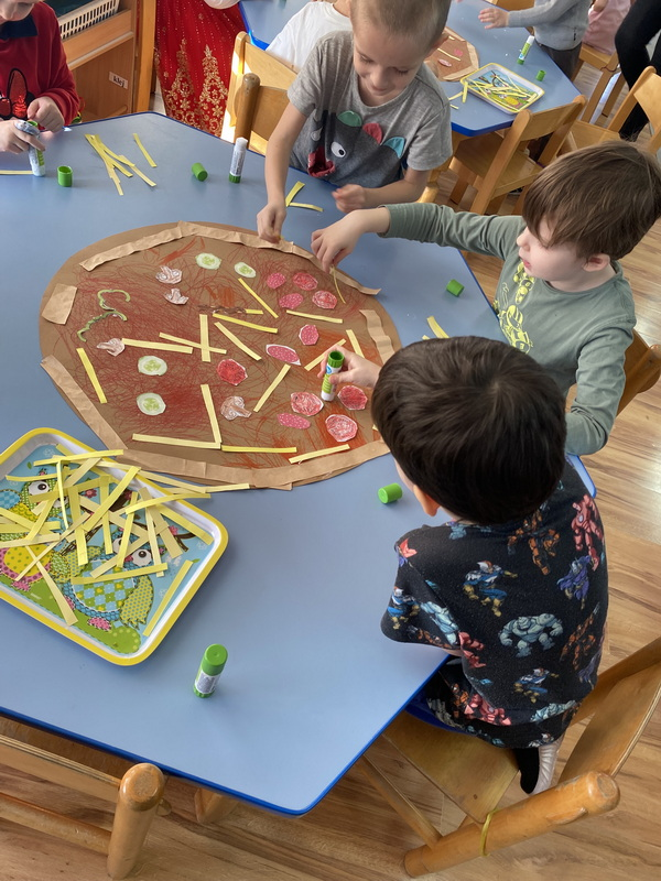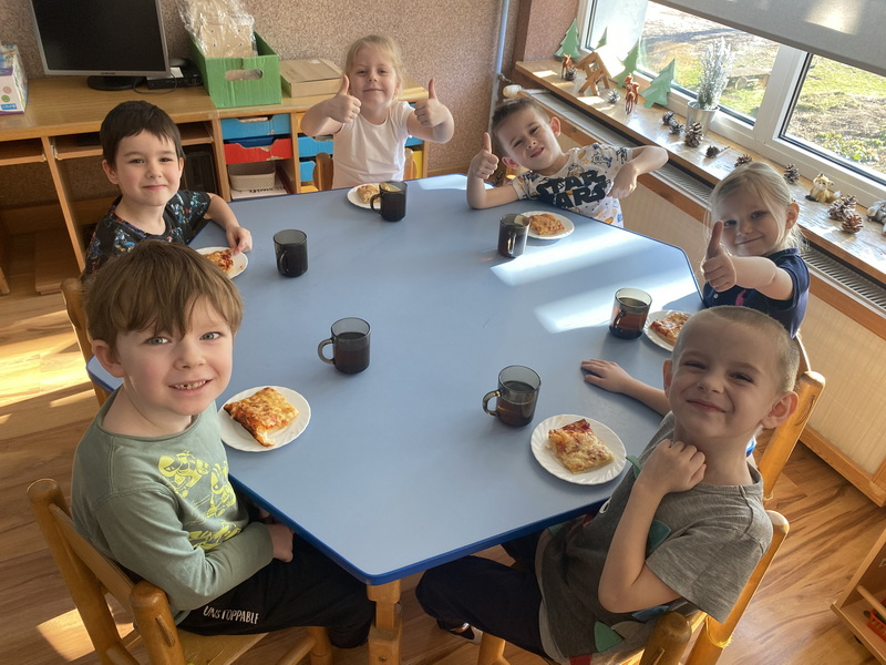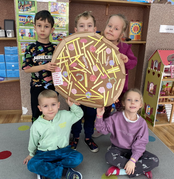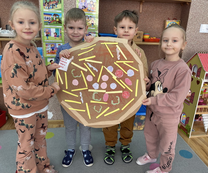 uczestniczyliśmy w zabawach tematycznych oraz zjedliśmy pyszną pizzę przygotowaną w naszej przedszkolnej kuchni.