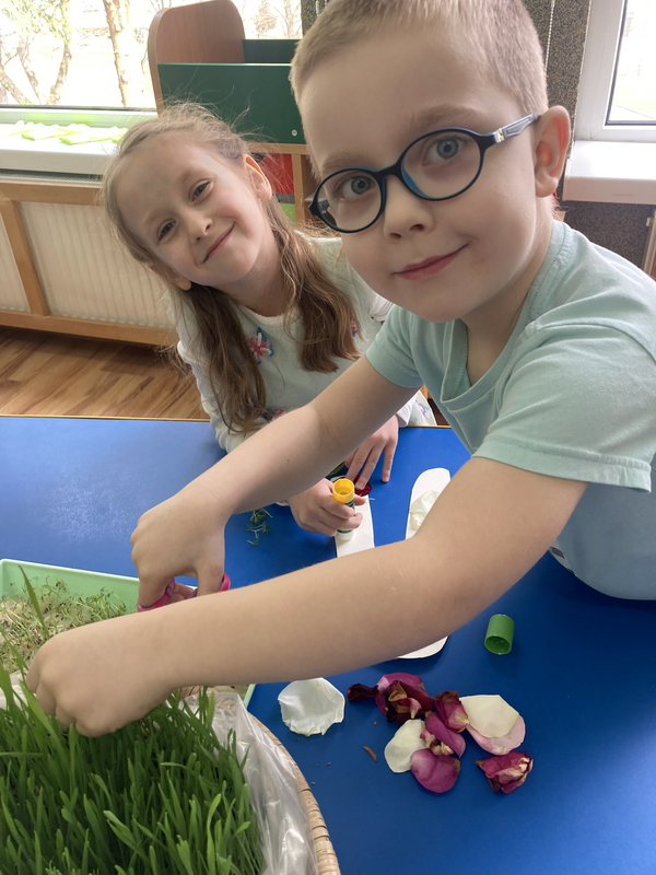 Pierwszy dzień wiosny spędziliśmy sensorycznie, wykonaliśmy piękne żabki oraz napis stworzony z darów natury.