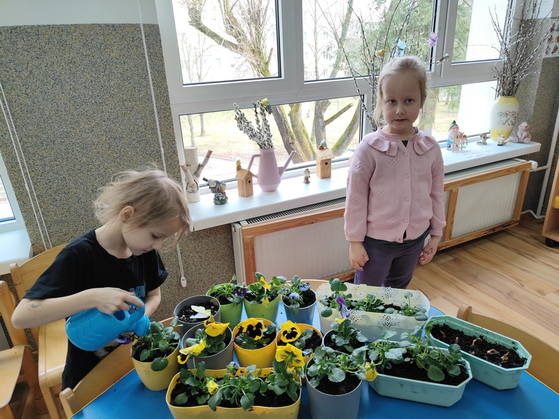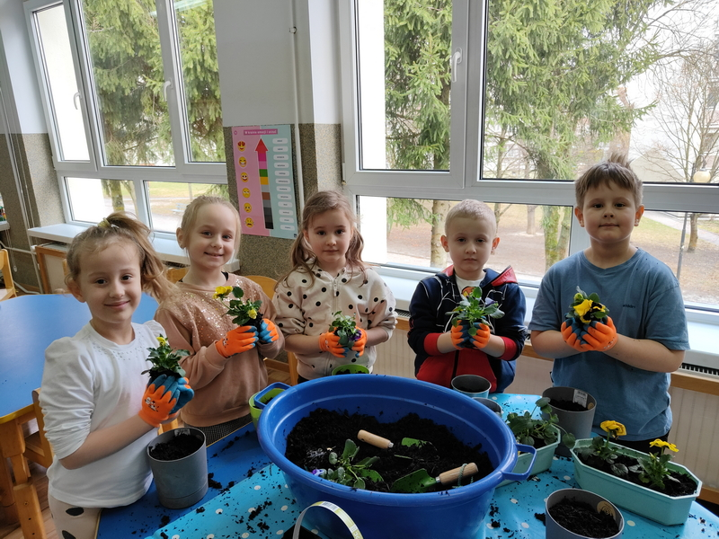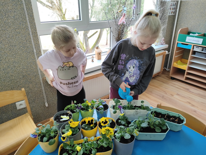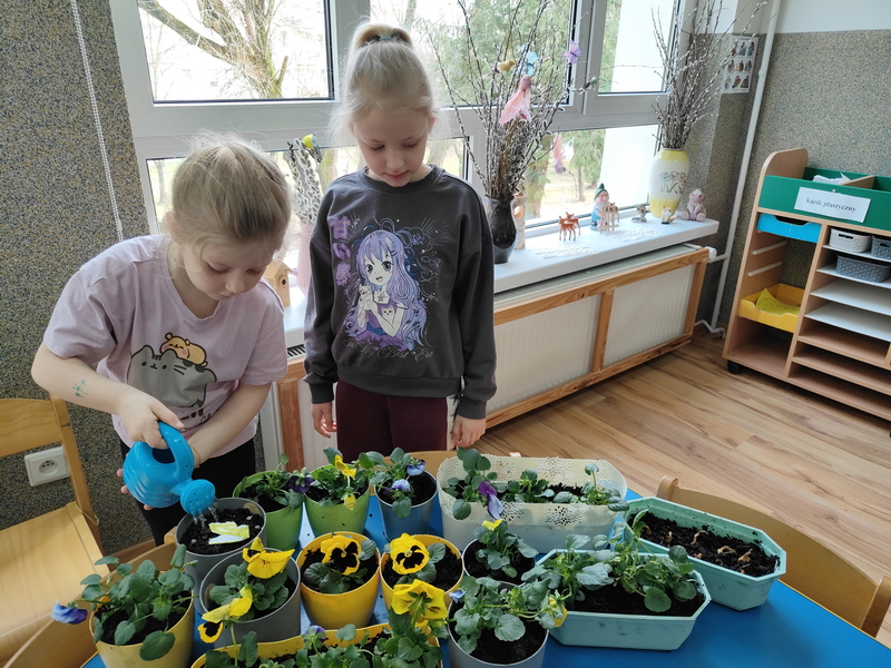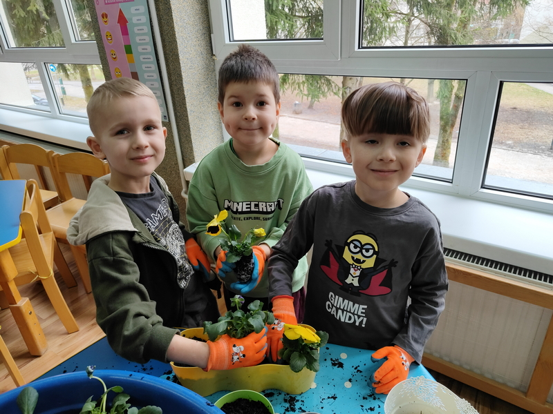 Wspólnie posadziliśmy także kolorowe bratki, które będą ozdabiać nasze parapety i wprowadzą wiosenną atmosferę do sali.