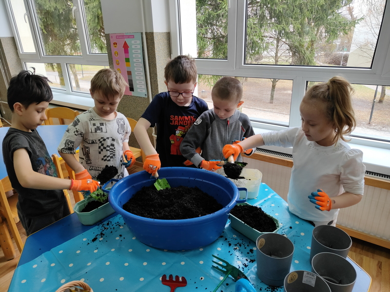 Podczas dzisiejszych zajęć dzieci założyły hodowlę fasoli, groszku oraz szczypiorku.