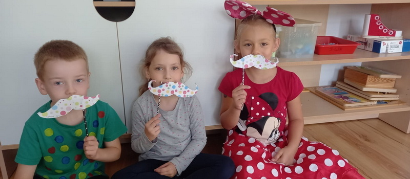 Tego dnia wykonując "kropkowe wąsy" rozwijaliśmy motorykę małą, analizowaliśmy opowiadanie o pewnej Kropce oraz układaliśmy kropkowe rytmy.